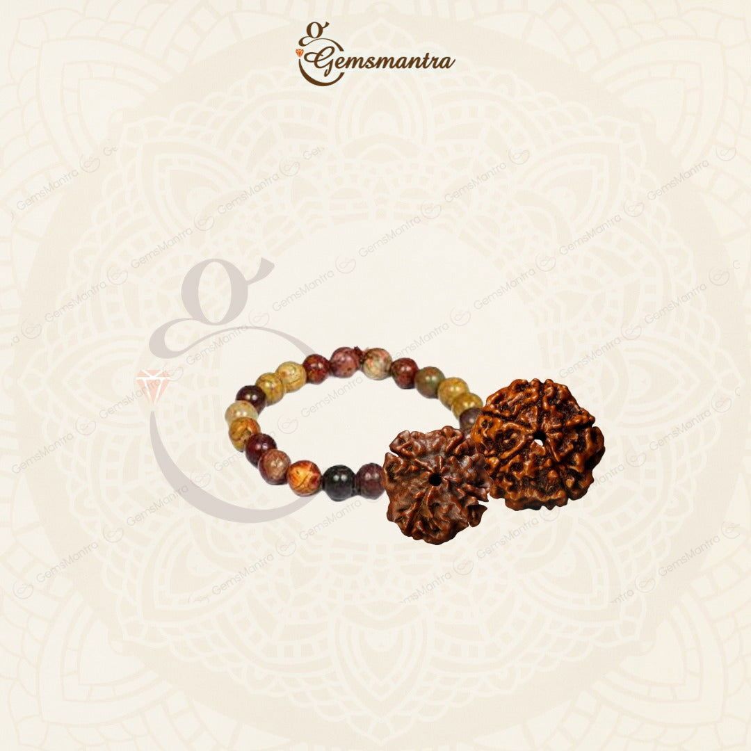 This Rudraksha and Crystal Bracelet combo of 4 Mukh rudraksha 5 Mukhi rudraksha and Picasso Jasper bracelet is specially crafted to provide you with a powerful remedy for the missing numbers 4, 9, or 2 in your Lo Shu Grid.