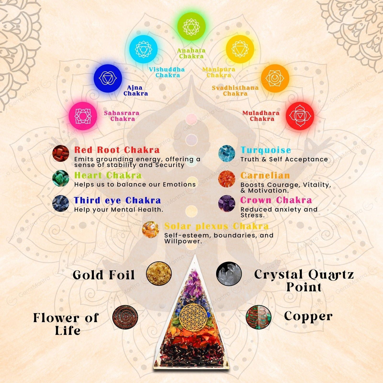 The Seven Chakra Chips Nubian Pyramid is a powerful energy tool that balances and aligns all seven chakras. It promotes overall well-being, mental clarity, and emotional stability. This pyramid enhances energy flow, reduces stress, and supports spiritual growth, making it a perfect addition to your healing journey.